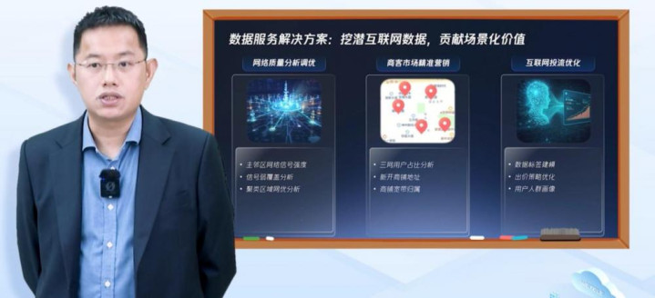 在数据服务方面,腾讯云注意到数据对于运营商的三块价值:数据助力调优治理、商客市场走向精准营销、线上投流趋于降本增效。腾讯云打造数据服务解决方案,通过深度挖掘数据,可以为运营商提供精准高效的数据支撑,例如信号弱覆盖分析、三网用户占比分析、用户人群画像等。