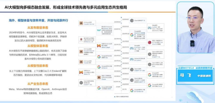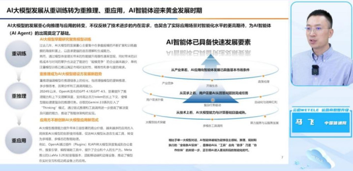 当前,大模型向多模态发展,形成全球技术领先者与多元应用生态共生格局。AI大模型发展从重训练转为重推理、重应用,AI智能体迎来黄金发展时期。马飞谈到,AI大模型的发展重心向推理与应用的转变,不仅反映了技术进步的内在需求,也契合了实际应用场景对智能化水平的更高期待,为AI智能体的出现奠定了基础。