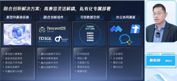 在融合创新方面,腾讯云看到三个变化:一是我国已经进入到系统攻坚阶段,要求业界构建全栈可控、安全可靠的技术底座和生态体系;二是可信数据空间正在从试点走向规模部署,呼唤基础设施的强力支撑;三是智能办公更关注AI协同、多人在线协作、工作流等能力。腾讯云为此助力运营商搭建了新型AI基础设施,提供融合创新组件以及可信数字化底座,和企业微信、腾讯文档、腾讯会议等应用,从单点创新走向系统级创新。
