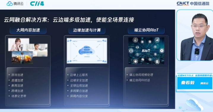 在云网融合方面,腾讯云注意到了几个趋势:跨境数据传输激增、业务场景化转型、专网推动边缘计算落地、IoT平台加速智能化成为AIoT。针对上述变化,腾讯云提出的云网融合解决方案进行了针对性部署,例如面向直播加速、跨境加速等场景,提供高性能高可用的内容分发和传输服务;依托广泛覆盖的边缘节点,为高带宽服务提供底层支撑;提供端云协同的视频处理能力、AI对话能力等。