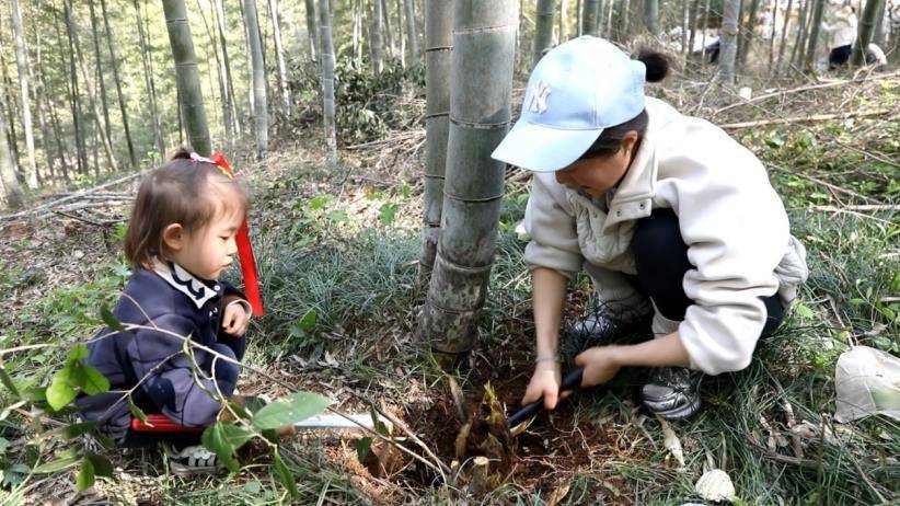 母女同心协力挖竹笋。